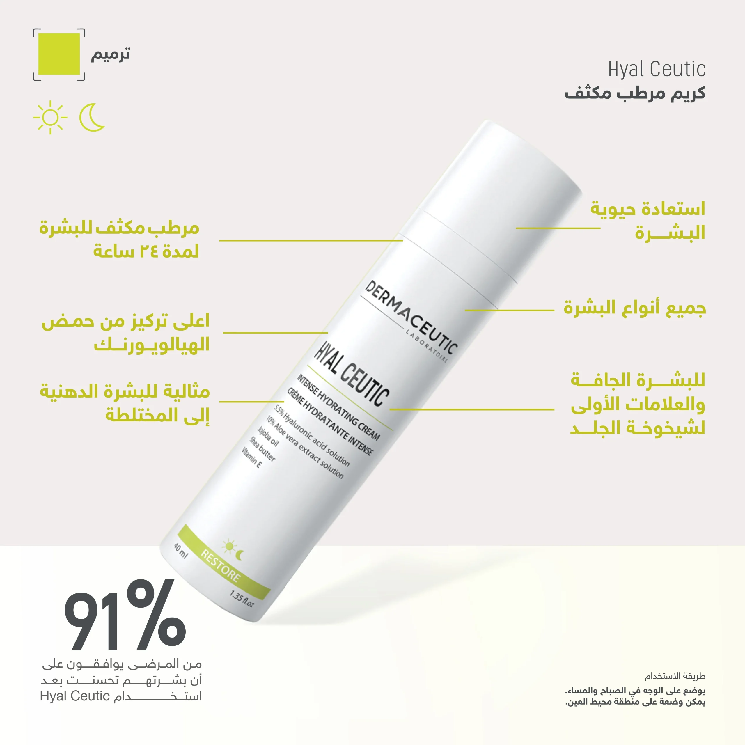 يتم وضع كمية صغيرة من الكريم على راحة اليد ويُوزع بلطف على الوجه والرقبة.