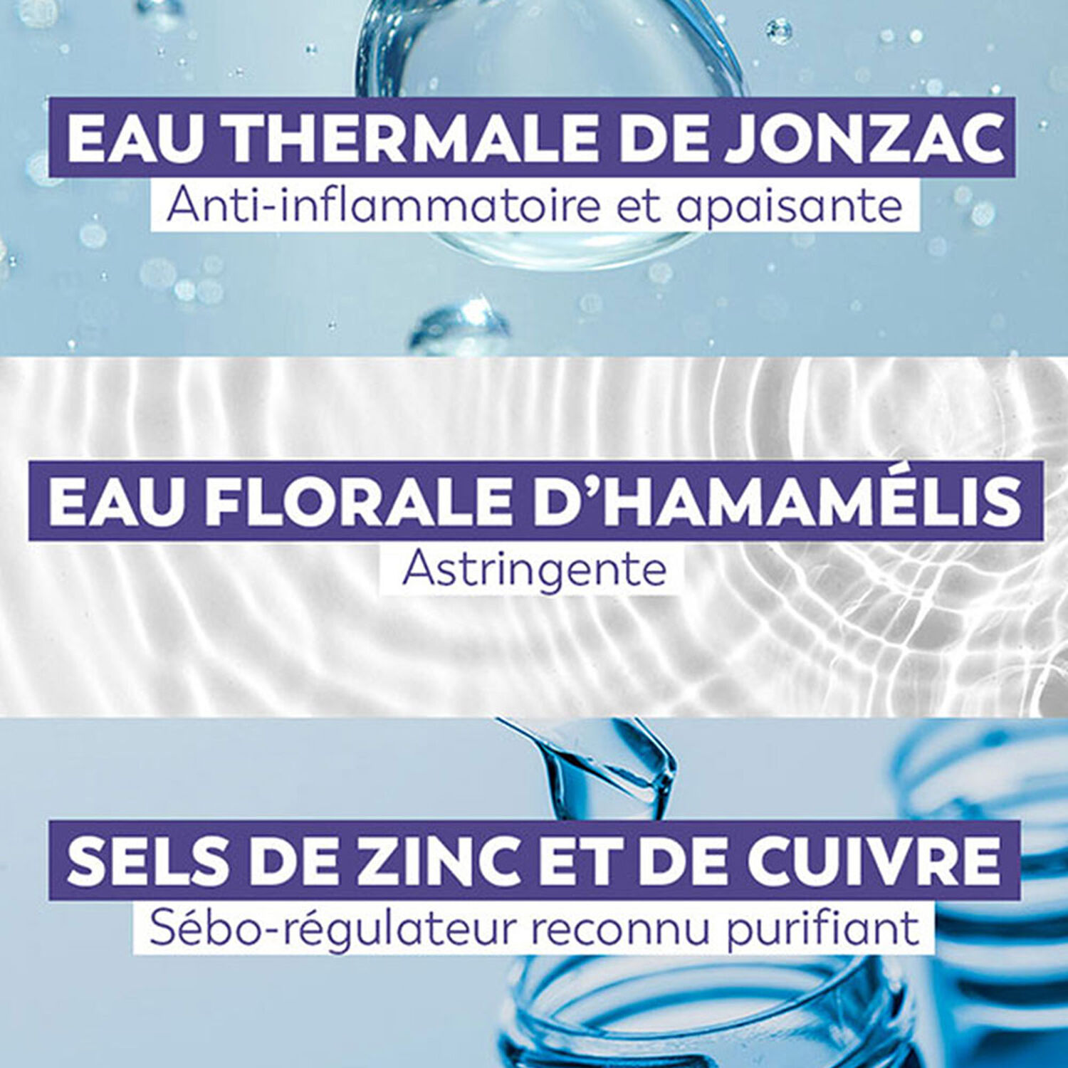 تركيبة تحتوي على: 20% من المياه الحرارية في جونزاك، وأملاح النحاس والزنك ذات المصدر الطبيعي والمعروفة بخصائصها المنقية، ومنظفات نباتية لطيفة.