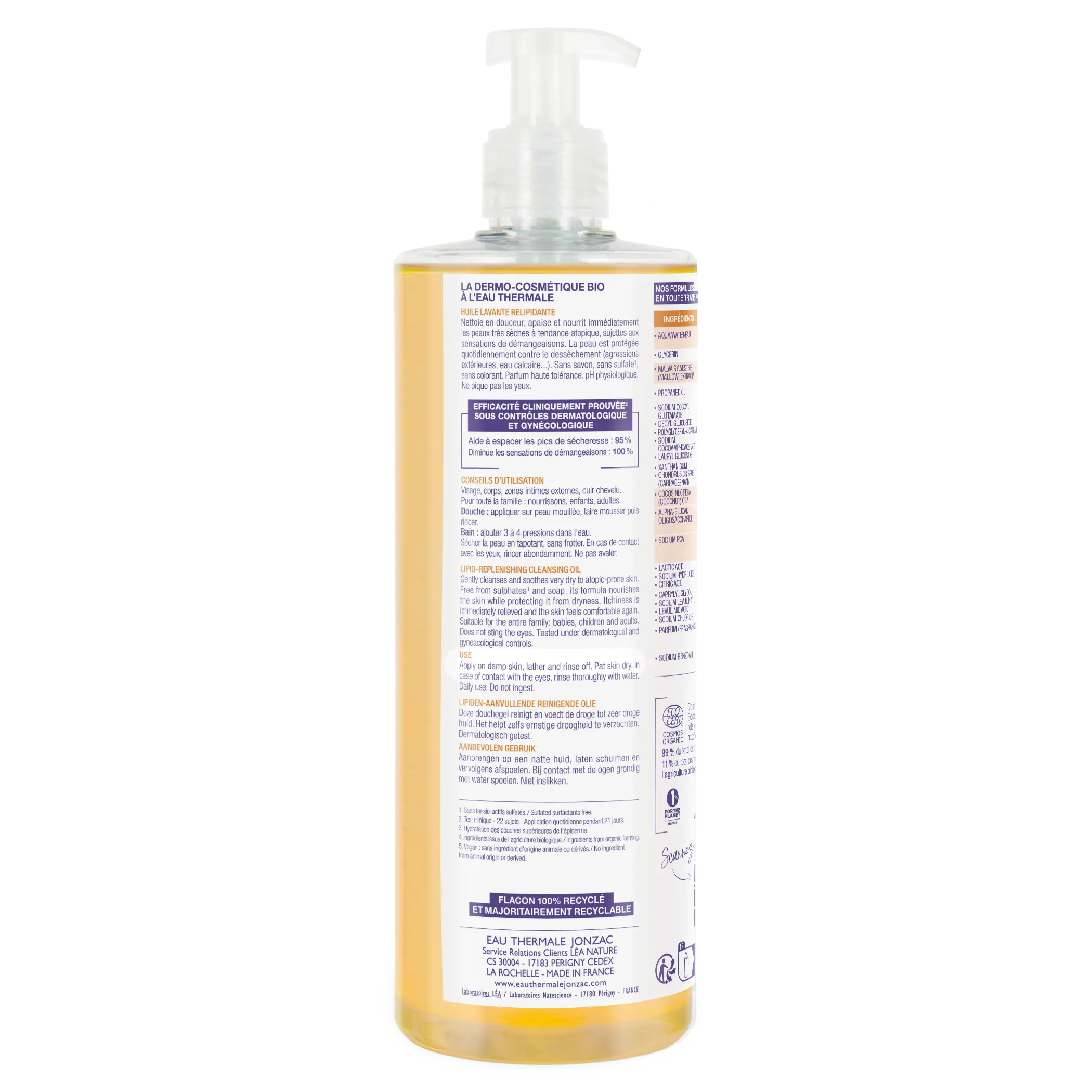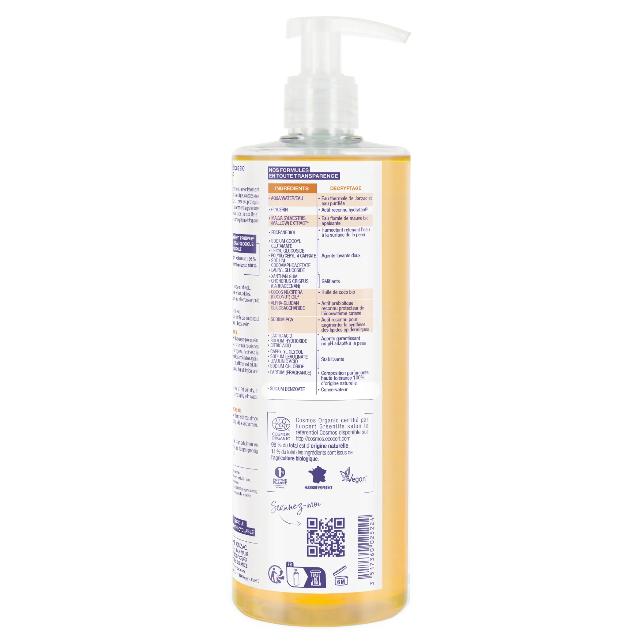 وهو خالٍ من الصابون والكبريتات والأصباغ، وينظف الجسم والمناطق الحساسة والوجه وفروة الرأس.