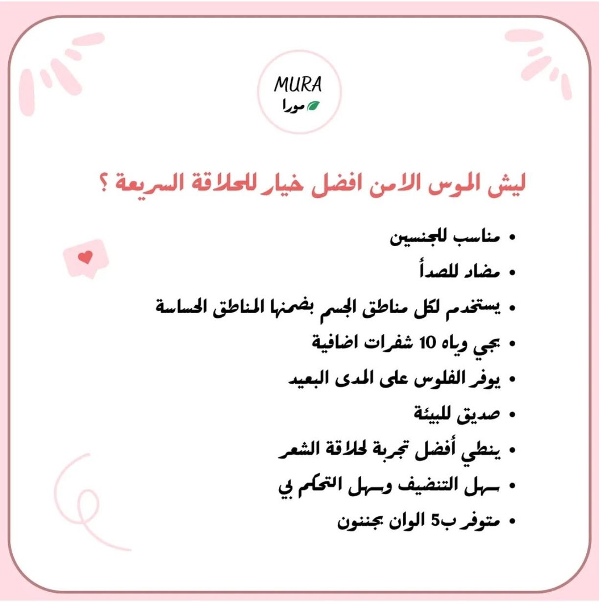 ✨ ما اكو شي أجمل من شعور النعومة والنظافة ??موس الجسم الدائم من مورا ? يوفرلكم حلاقة مريحة وامنة وسعيدة !? مواصفات رهيبة: • يدوم مدى الحياة ? يعني استثمار مرة وحدة وخلص! • آمن وصديق للبيئة ☘️ يعني يهتم بيكم وبأمنا الارض ? • يجي ويّاه 10 شفرات تكفي قرابة سنة كاملة ✨ • متوفر عدنا شفرات احتياطية ✔️? تشتروه مرة وحدة وراح يكون اخر شفرة تحتاجوها بحياتكم ? اطلبوه هسة واستمتعو بتجربة حلاقة امنة ومريحة ??!